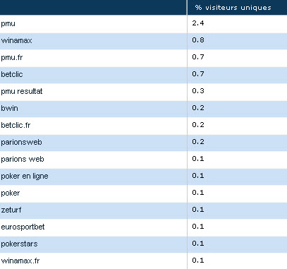 • PMU reste le mot le plus souvent saisi avant de visiter un site de jeux d’argent en ligne : 2,4% des internautes l’ont tapé avant de se rendre sur l’un des sites de la catégorie (vraisemblablement PMU.fr : 1% supplémentaires des internautes ont effectué une recherche avec un terme apparenté). Pourtant, il n’arrive qu’en deuxième position en matière d’audience, après PartyPoker.fr (cf. p. III).